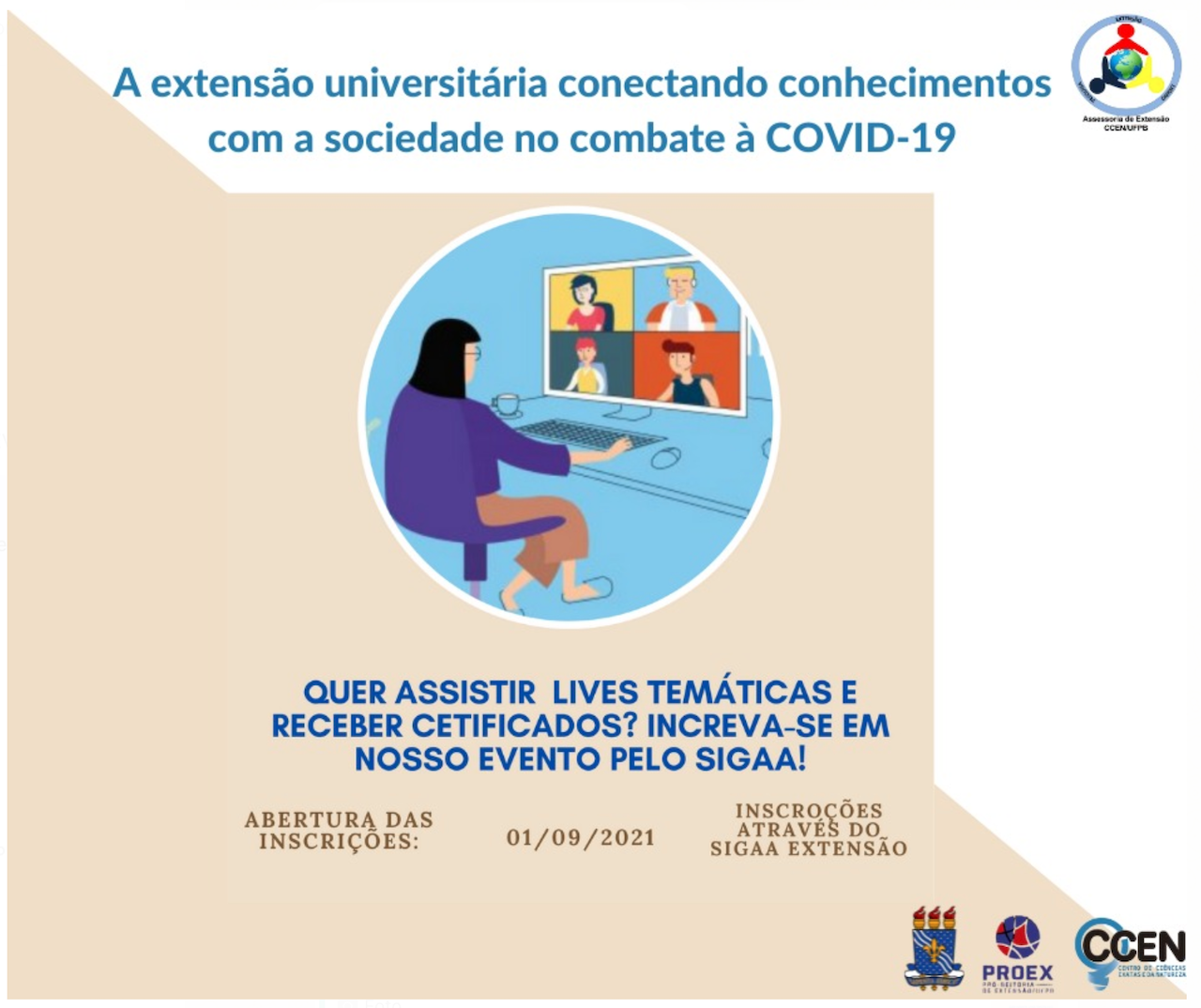 O Centro de Ciências Exatas e da Natureza (CCEN) da Universidade Federal da Paraíba (UFPB), por meio da Assessoria de Extensão do CCEN, realiza lives para promover o diálogo com a comunidade acadêmica e a sociedade sobre temas relacionados ao combate à Covid-19. As transmissões serão realizadas no período de 08 de setembro 2021 a 07 de outubro de 2021, com a carga horária total de 40 horas, por meio da plataforma Instagram da Assessoria de Extensão do CCEN.